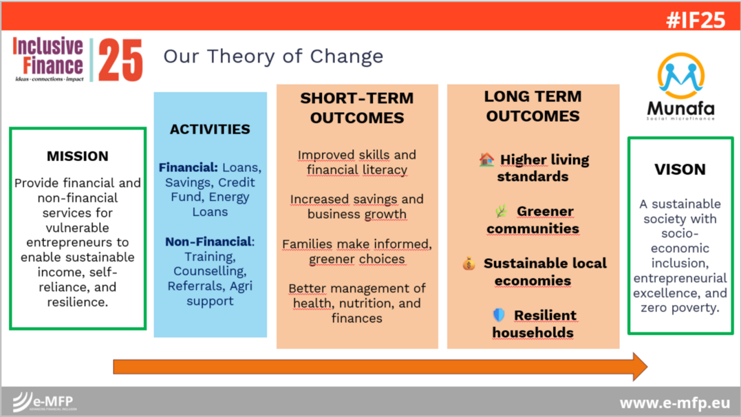 - Munafa Social Microfinance (Sierra Leone) concrete experience with technical support from Entrepreneurs du Monde: Munafa developed a Theory of Change, linking activities to outcomes, and a set of social performance indicators to measure progress – with recently added environmental indicators. This example illustrates the combination of internal mechanisms and external evaluations, and step-by-step approach, adapted according to maturity.