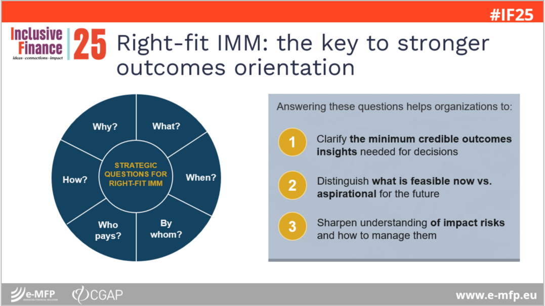 - CGAP’s theoretical framework for Right-fit Impact Measurement and Management (IMM). “The question is not whether outcomes orientation is possible, but how far each organization can go given the situation at hand under the conditions in which it operates.” – Learn more: Towards Right-Fit IMM: Orienting Around Outcomes