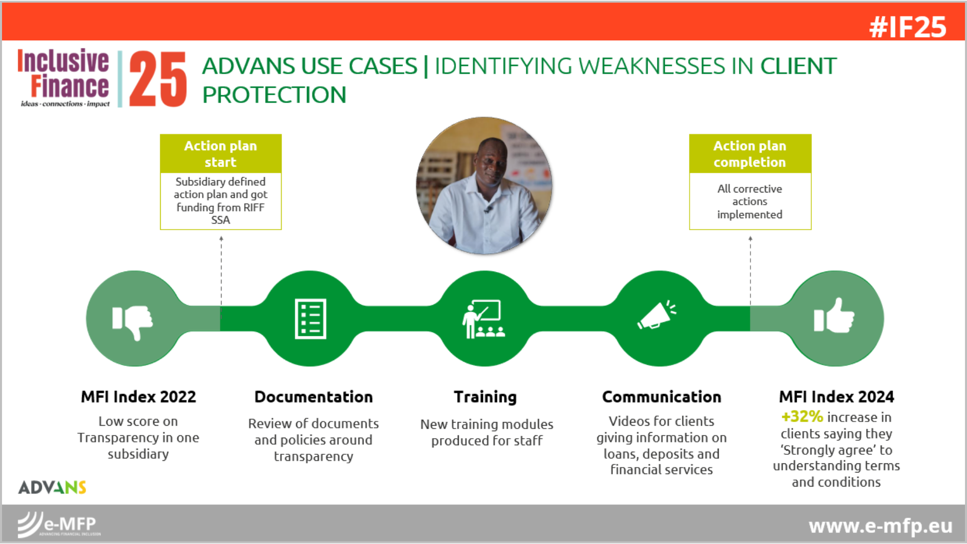 - Advans’s approach to collecting client voices on outcomes, and how they increase reliability by using data from several sources: external studies with 60 Decibels, internal studies, and data collected from loan files.