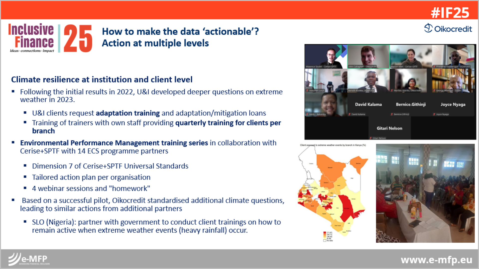 - Oikocredit’s experience of end-client self-perception survey to understand changes in the lives of clients and make the data actionable – combining end-client survey and internal MIS data to gain deeper insights about products and take action at multiple levels.